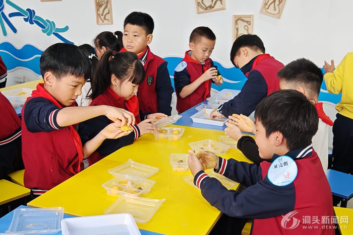 在开营动员结束后,紧凑而丰富的研学行程随即展开:上午,学生们化身“美食小匠人”,专注投入番薯饺制作,感受洞头美食文化的烟火气;下午,大家转场滩涂湿地,弯腰拾贝、追逐小蟹,在与海洋的亲密接触中,研学体验既添了趣味,更有了深度。