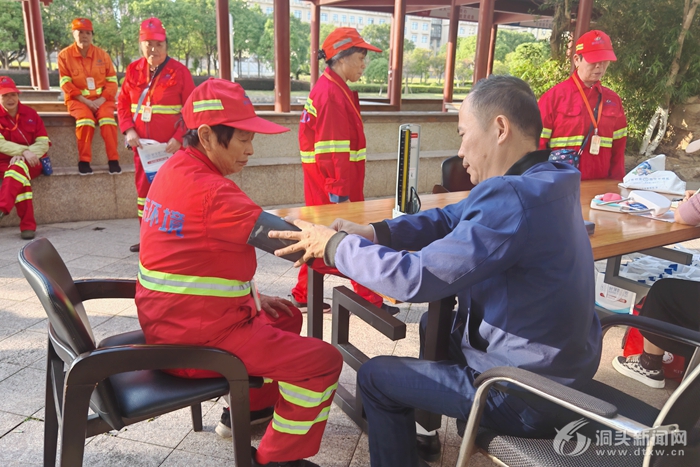 海霞公园驿站的空地前,身着橙色工装的环卫工人三五成群地围着义诊摊位,有的静坐量血压,有的配合口腔检查,志愿者手持牙齿模具,边演示边讲解牙齿养护要点。整个现场有条不紊,让奔波劳碌的劳动者,能在忙碌间隙收获一份贴心的健康关怀。