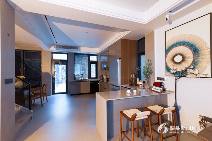 步入民宿,简约明亮的客厅瞬间抚平旅途疲惫。米白与浅灰的基调勾勒出干净纯粹的氛围,温润质朴的原木茶桌置于其间,适合与亲友围坐闲谈,共度悠闲时光。与茶室静谧氛围形成呼应的是开放式厨房,这里既是烟火气的诞生地,也是故事交融的空间,让住客在旅行中亲手烹制美食,感受居家般的温暖。