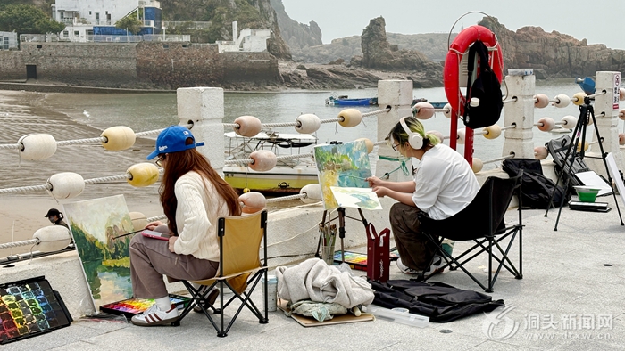 东岙沙滩上,海风轻拂,学子们或坐或站,支起画板、拿起画笔,将蔚蓝大海、柔软沙滩、错落渔村的景致一一勾勒。有的专注描摹礁石肌理,有的细致晕染海面光影,偶尔相互交流技法,用画笔定格洞头的多样之美。